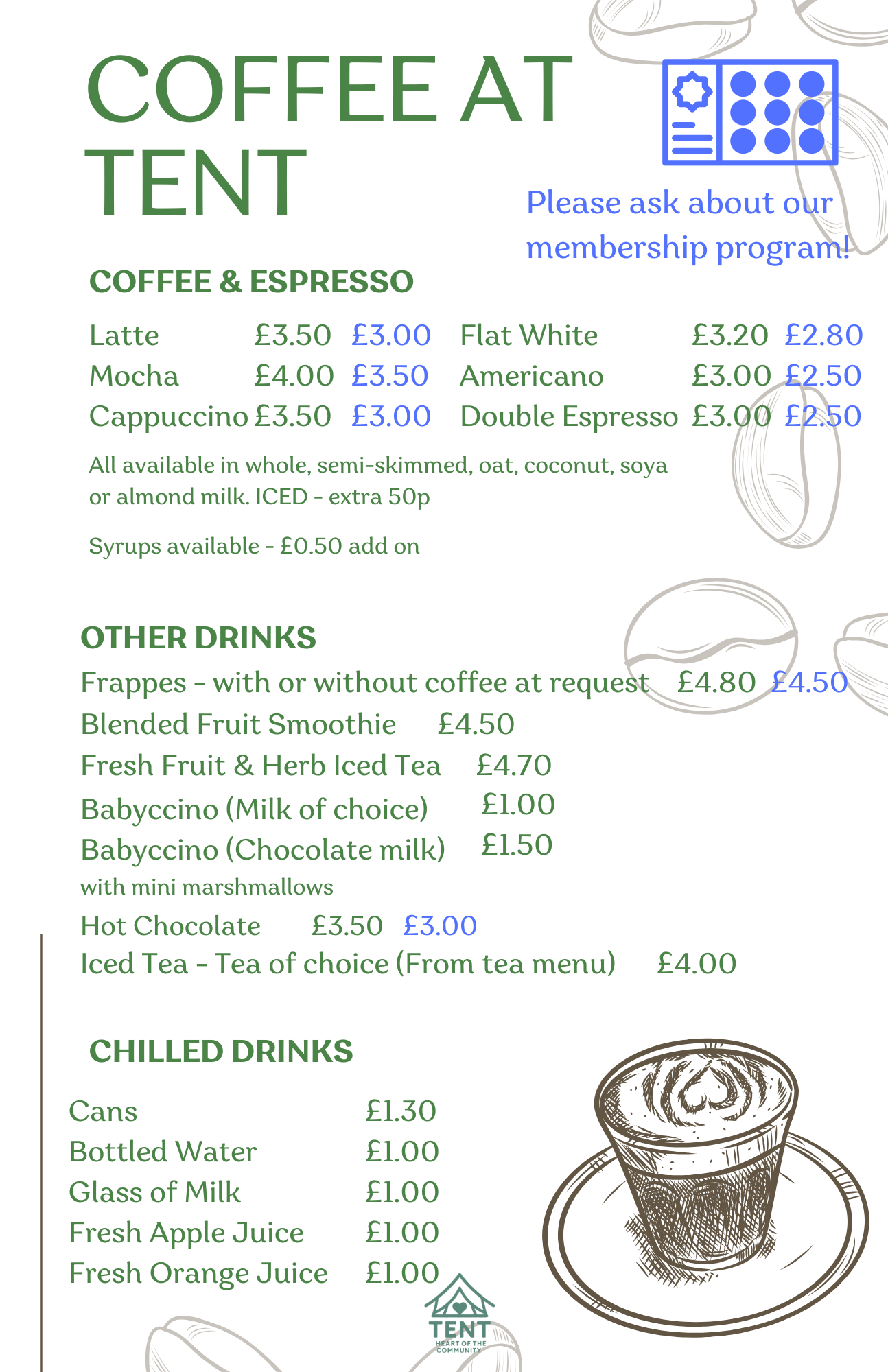 £10 per month to join, which gives you reduced members prices (in blue on the menu) and a free coffee for every full card.